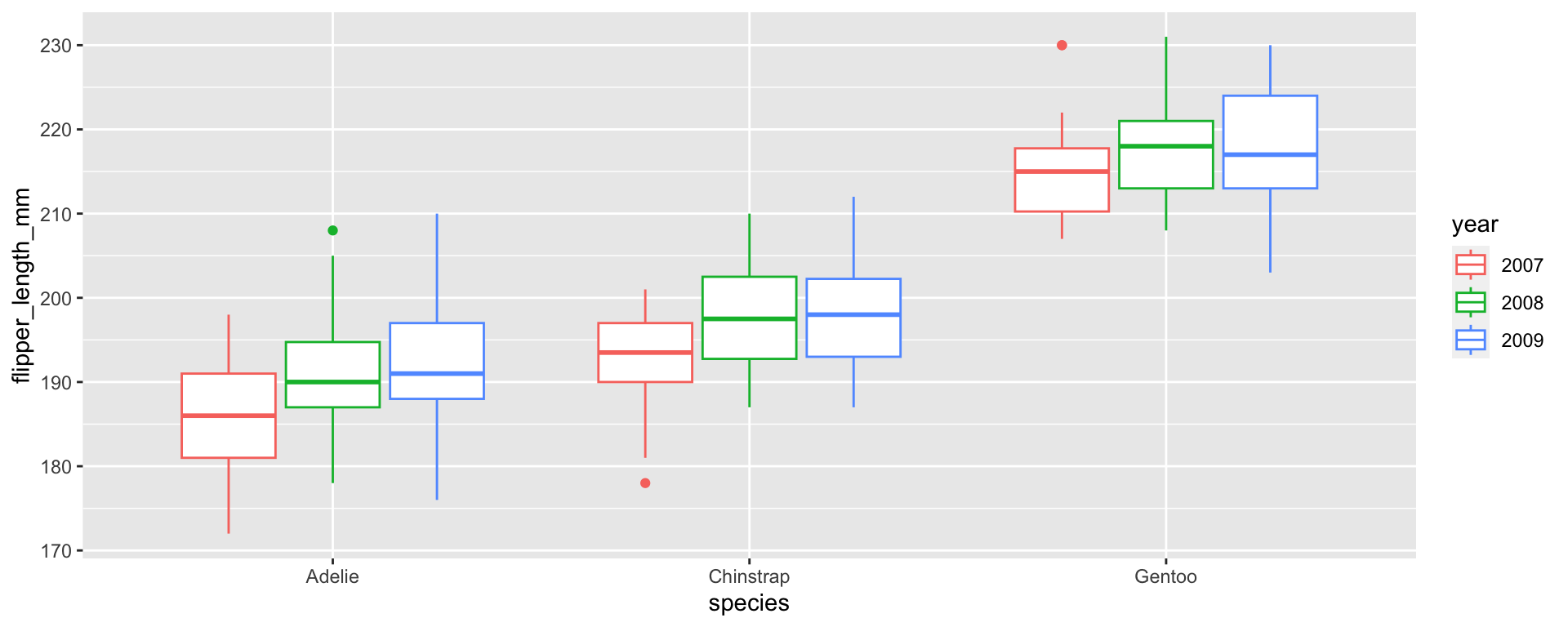 Let’s say we wanted to transform a “year” column from an integer to a factor to make a plot with a different boxplot for each year: