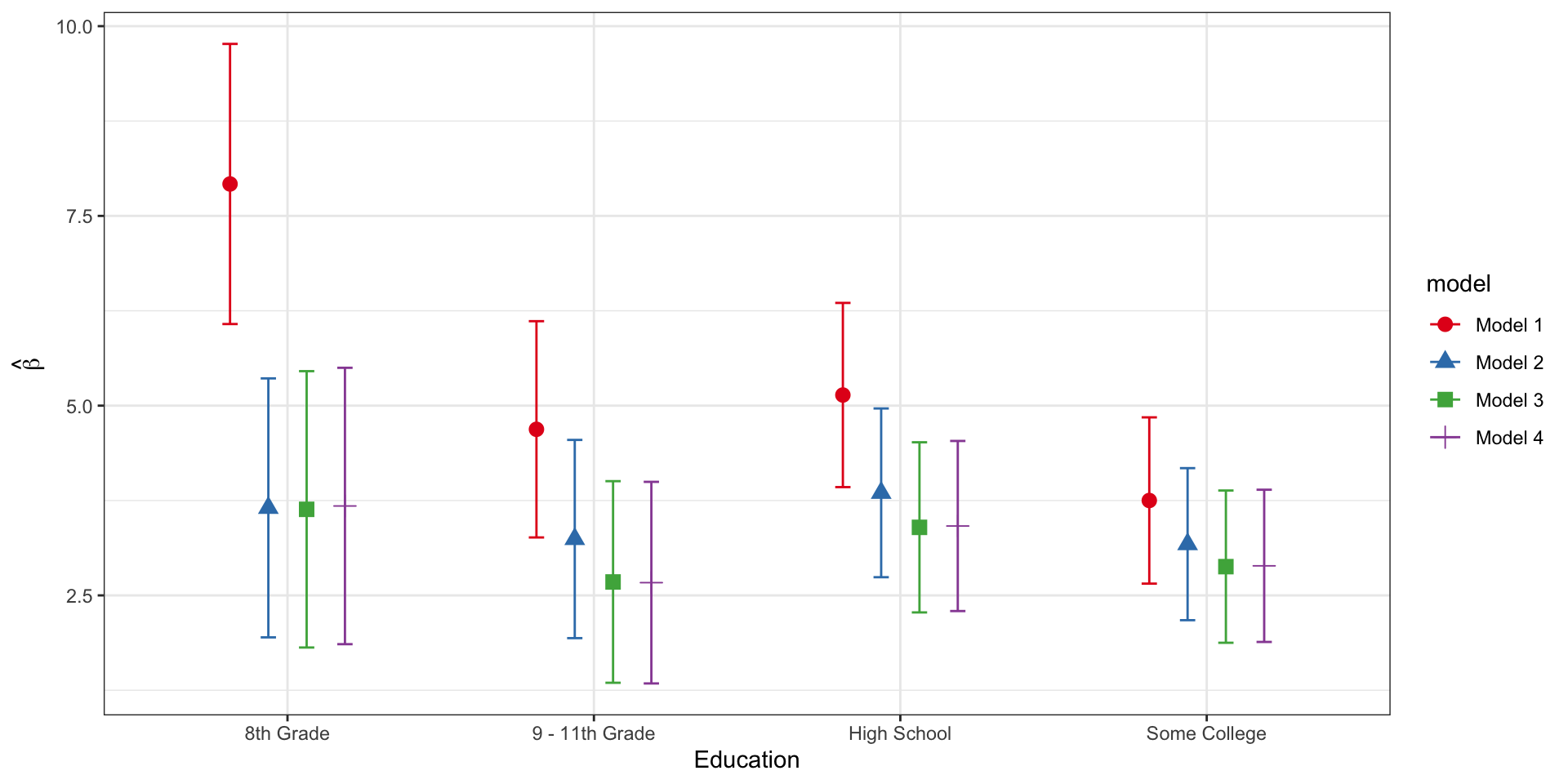 # Use ggplot to plot the point estimates and 95% CIs# Note that we are differentiating the models by color AND by the shape of the plotting symbolggplot(lm_education_estimates, aes(x=category, y=estimate, color=model, shape=model)) +# position=position_dodge() is specified so that the estimates are side by side rather than# plotted on top of one anothergeom_point(position=position_dodge(0.5), size=3) +# geom_errorbar allows us to plot the 95% confidence limitsgeom_errorbar(aes(ymin=conf.low, ymax=conf.high), position=position_dodge(0.5), width=0.2) +# scale_color_brewer allows me to control the colors for plotting the different modelsscale_color_brewer(palette="Set1") +labs(x="Education", y=expression(hat(beta))) +theme_bw()