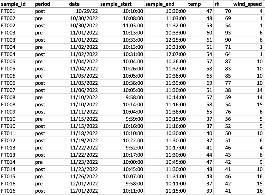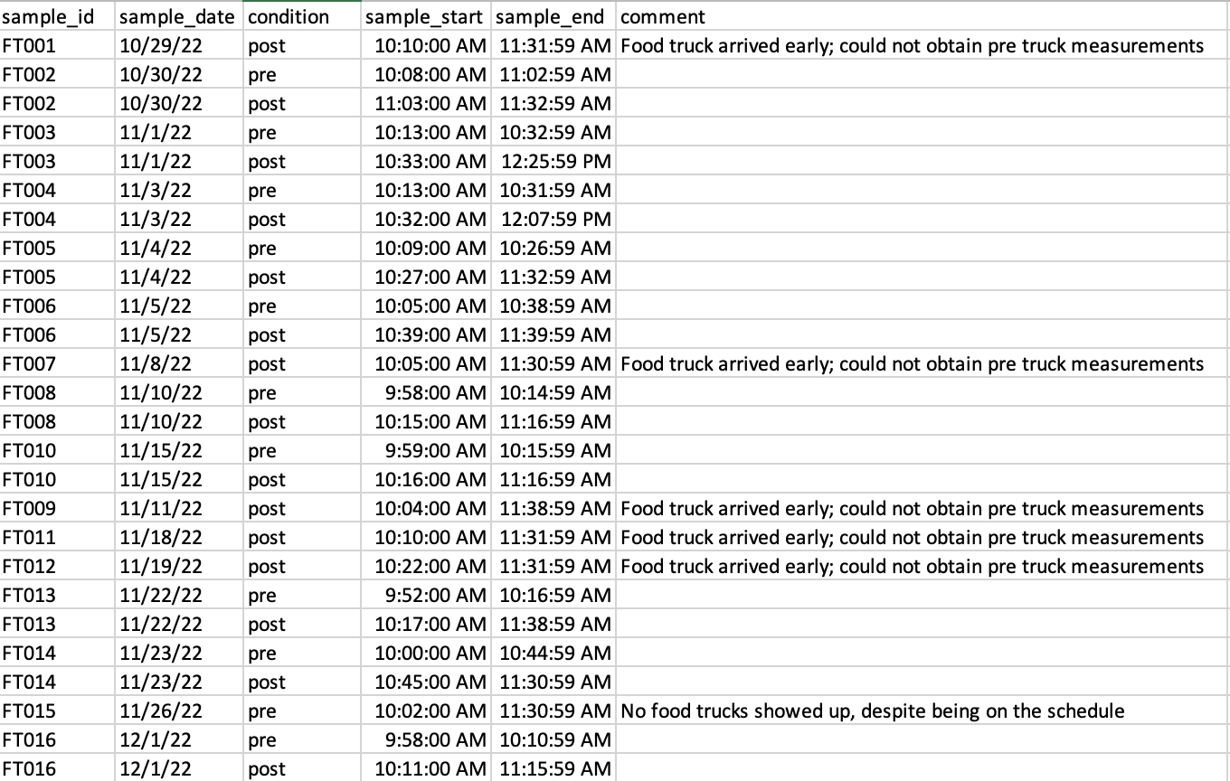 Figure B: Approximate timeline for the sampling protocol. Data collection began at approximately 10:00 AM and ended at approximately 11:30 AM. Food truck arrival times varied, but generally occurred between 10:15 and 11:00 AM.