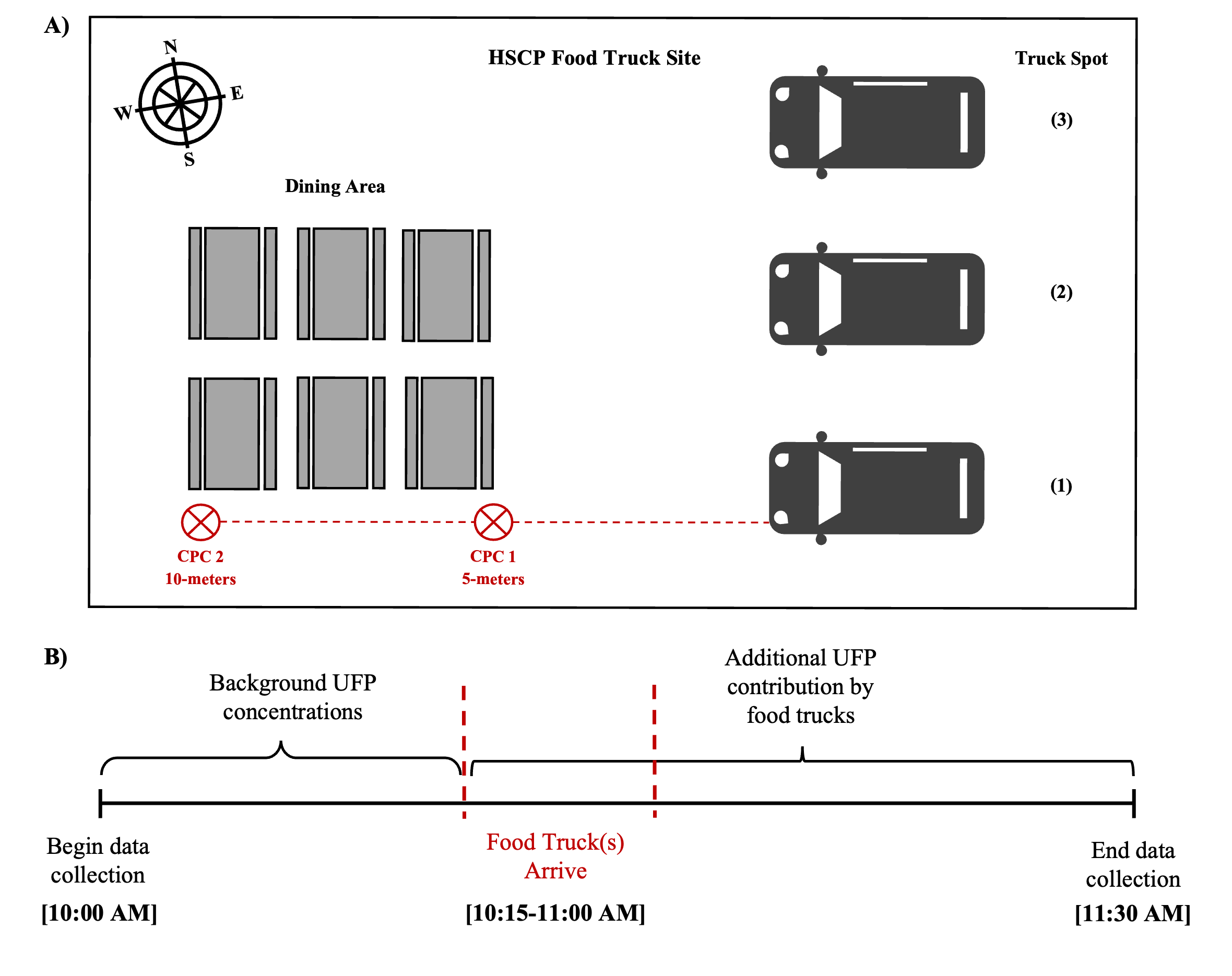 readrdplyrstringrlubridateggplotFigure A: Sampling site configuration at the HSCP. Condensation Particle Counter (CPC) placement in relation to the HSCP outdoor dining area and food truck parking area is shown in red.