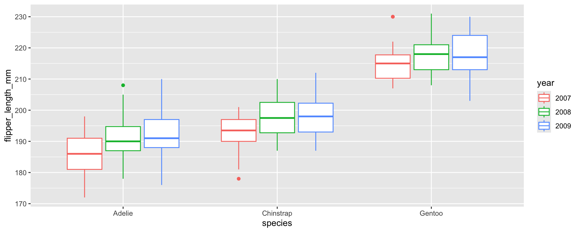 Let’s say we wanted to transform a “year” column from an integer to a factor to make a plot with a different boxplot for each year: