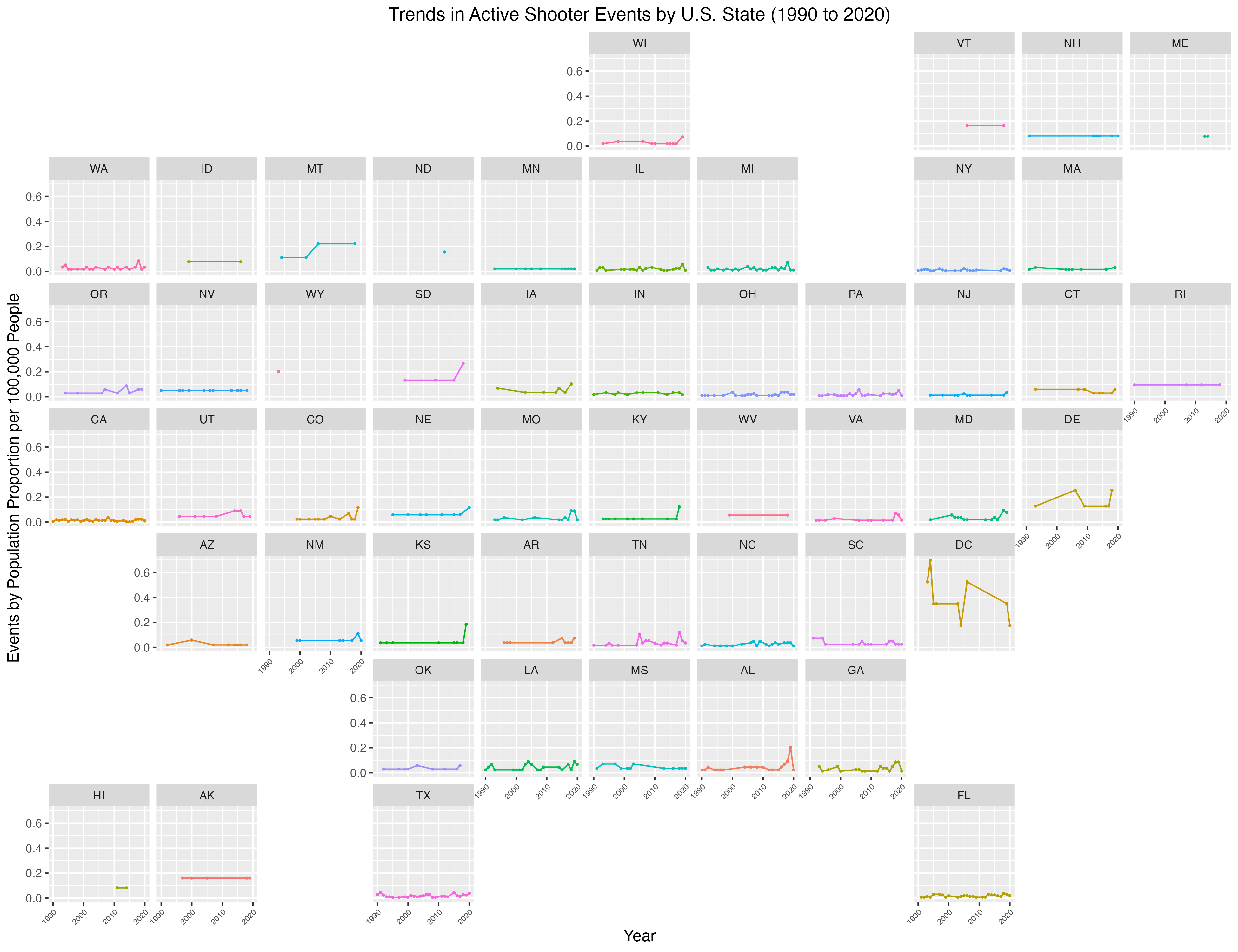 We ran our regression analysis to find associations between school shooting events and gun laws. Of note, the only significant associations were with the presence of laws that dictated a minimum age for handgun possession and laws that allowed court-ordered gun removal for a person posing danger to themselves or others. The handgun possession law was associated with fewer school shooting events, which aligns with our descriptive analysis showing most shooting events occurred with handguns. Suprisingly, the law allowing for court-ordered gun removal was associated with increaesd shooting events. One explanation could be most shooting events were not pre-planned attacks, so being able to identify someone as a danger to themselves/others then removing their gun may not be as effective. Also, while a child may be the perpetrator of the gun violence attempt, only the adult owner of the gun may be evaluated for their gun possession ability. Another explanation could be this law was passed in states with high gun ownership to temper the occurrence of shooting events. So, by prevalence of gun ownership, there would be an increased number of shooting events.