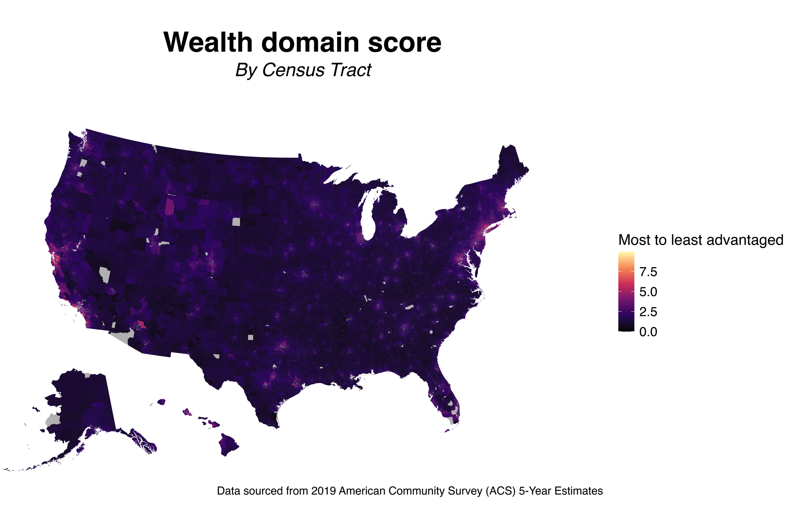 Wealth (\(Y_i\)) is our main exposure at a tract i. Wealth is a standardized measure that was built from (1) aggregate home value, (2) median real estate taxes paid, (3) median home value, (4) median gross rent, (5) median monthly mortgage, (6) owner-occupied homes census tract data (Dyer et al., 2023).