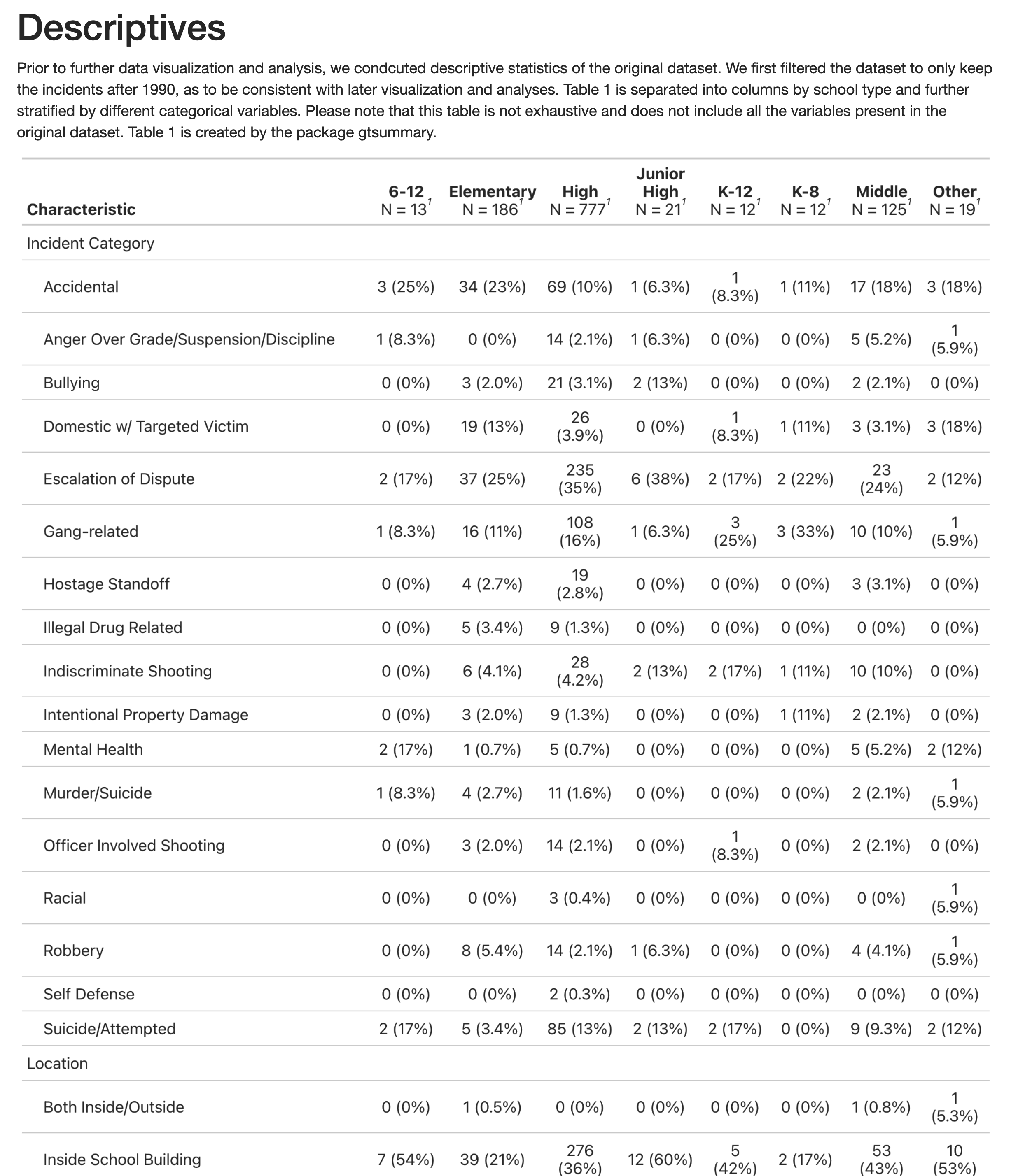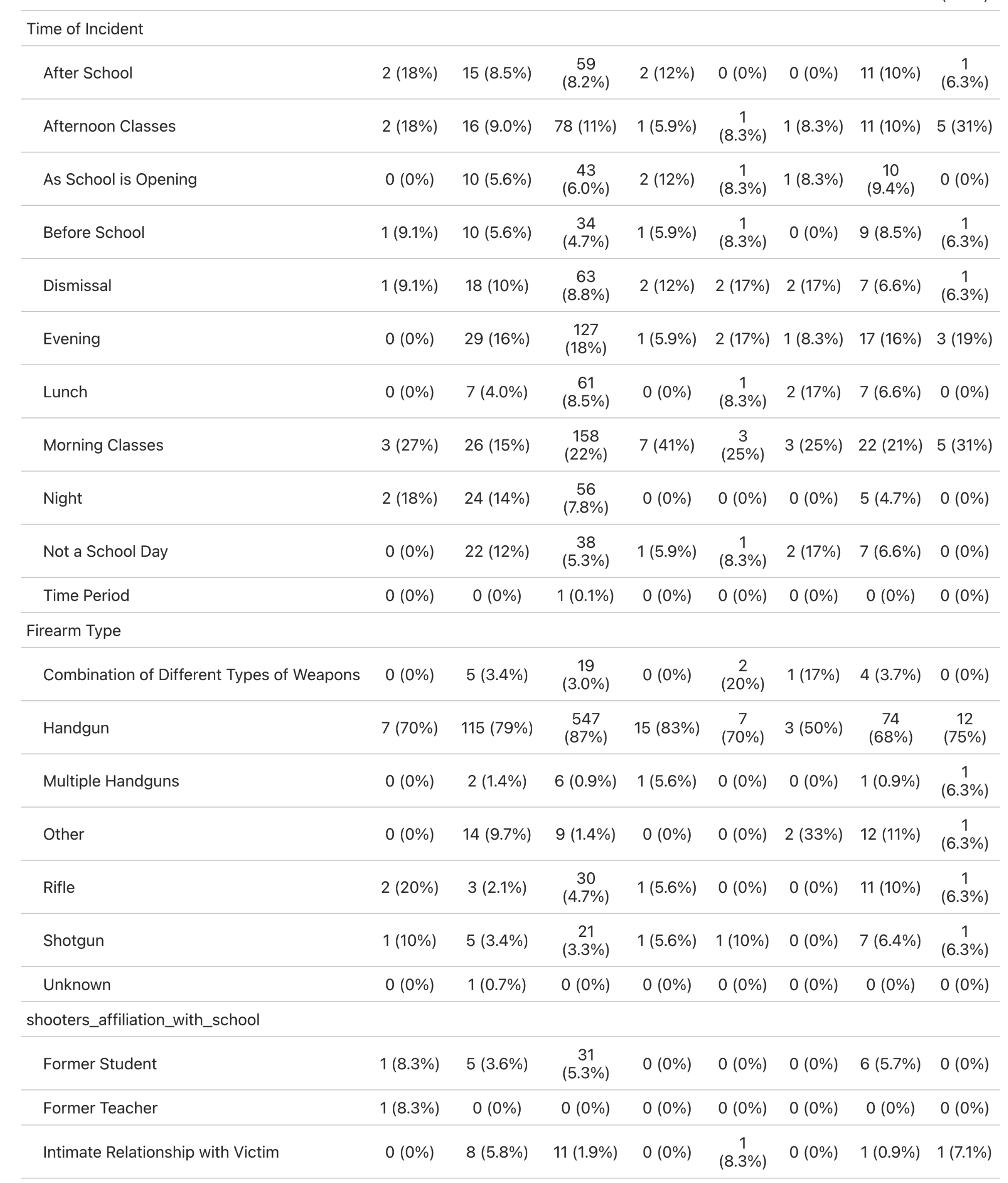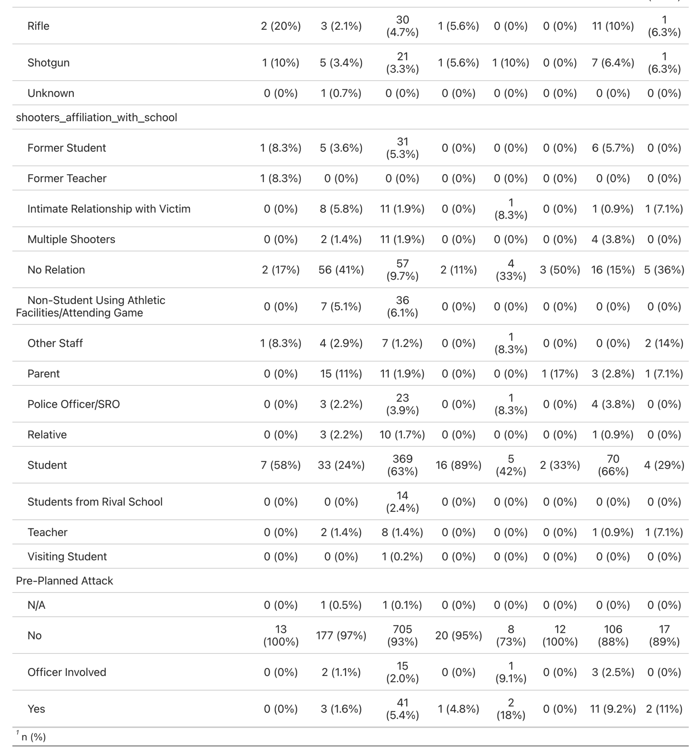 This study brought interesting themes to light on the nature of school shooting events. Particulary, our descriptive analysis showed these events were typically in response to an escalation of a dispute and carried out with a handgun. Location wise, the majority of events occurred in high school and commonly oustide the school. Also, the vast majority were not pre-planned attacks.