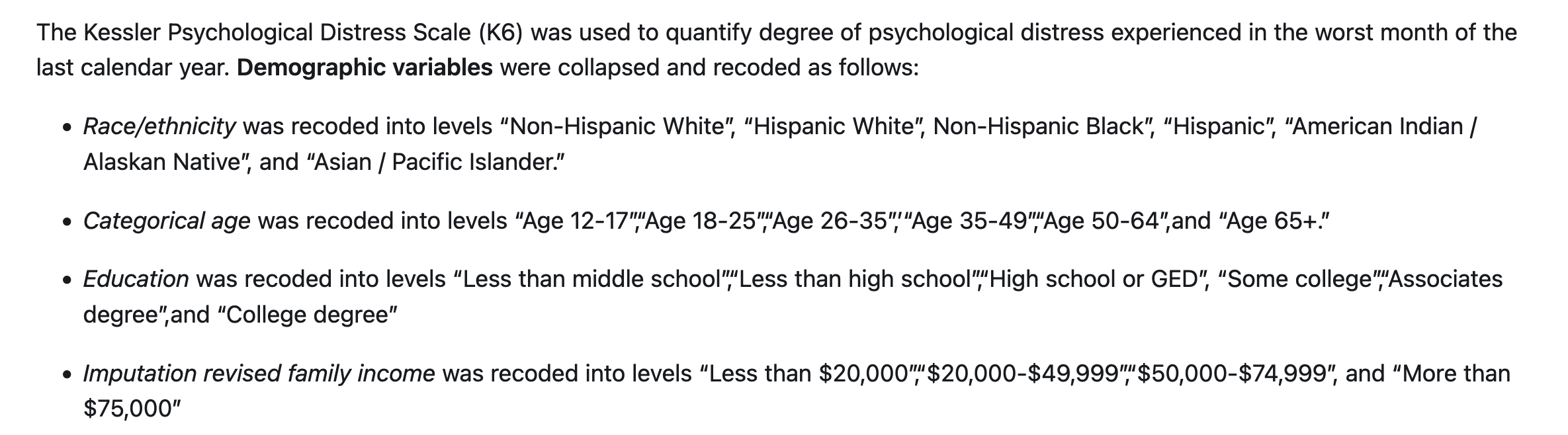 df_final <- df_final %>%mutate(agecat =factor(case_when(age==1| age==2| age==3~'Age 12-17', age==4| age==5| age==6~'Age 18-25', age==7| age==8~'Age 26-35', age==9~'Age 35-49', age==10~'Age 50-64', age==11~'Age 65+'),levels=c('Age 12-17','Age 18-25','Age 26-35','Age 35-49','Age 50-64','Age 65+')))df_final <- df_final %>%mutate(racecat =factor(case_when(race_ethnicity==1~'NHW', race_ethnicity==2~'NHB', race_ethnicity==7~'Hispanic', race_ethnicity==3~'AIAN', race_ethnicity==4| race_ethnicity==5~'NHAPI', race_ethnicity==6~'More than one race'),levels=c('NHW','NHB','Hispanic','AIAN','NHAPI','More than one race')))df_final <- df_final %>%mutate(urban =factor(case_when(urban_Rural==1~'Large Metro Area', urban_Rural==2~'Small Metro Area', urban_Rural==3~'Non-metropolitan'),levels=c('Large Metro Area','Small Metro Area','Non-metropolitan')))df_final <- df_final %>%mutate(sex =factor(case_when(sex_Gender==1~'Male', sex_Gender==2~'Female')))df_final <- df_final %>%mutate(educcat =factor(case_when(education==1| education==2| education==3~'Less than middle school', education==4| education==5| education==6| education==7~'Less than high school', education==8~'High school or GED', education==9~'Some college', education==10~'Associates degree', education==11~'College degree'),levels=c('Less than middle school','Less than high school','High school or GED','Some college','Associates degree','College degree')))df_final <- df_final %>%mutate(inccat =factor(case_when(family_income==1| family_income==2~'Less than $20,000', family_income==3| family_income==4| family_income==5~'$20,000-$49,999', family_income==6~'$50,000-$74,999', family_income==7~'More than $75,000'),levels=c('Less than $20,000','$20,000-$49,999','$50,000-$74,999','More than $75,000')))